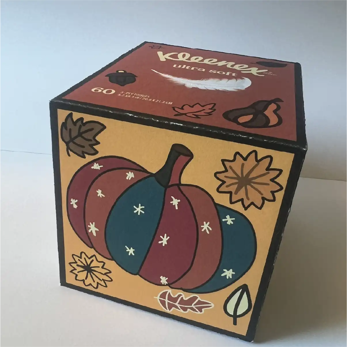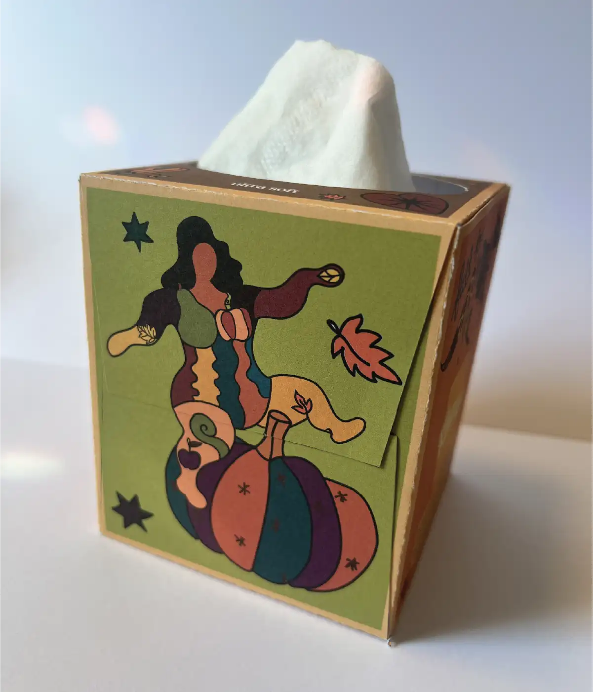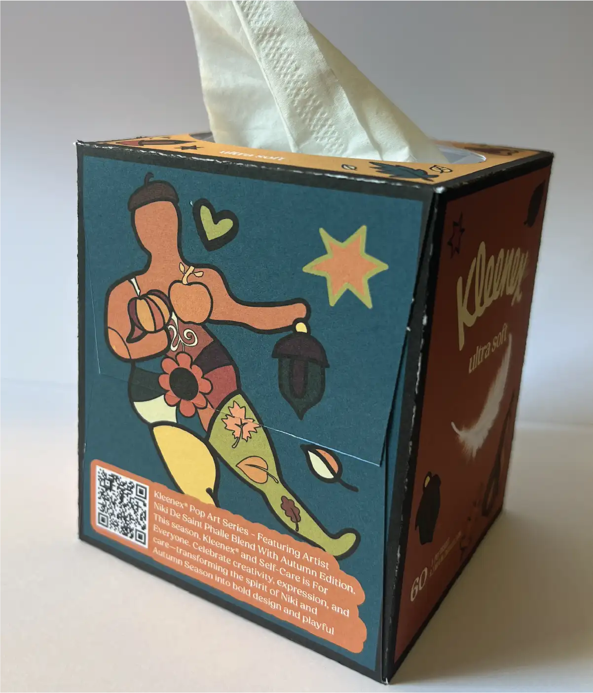 To make the series feel more cohesive, I designed four boxes as a unified set using Nikki de Saint Phalle's pop art as inspiration. Since her physical sculptures—with their multi-medium inlays—could not be translated directly onto a Kleenex box, I created my own vector-based drawings, incorporating an overall fall motif to decorate each side. I used strokes of varying weights to emphasize shifts in color, echoing how her real-life mosaics use different materials to create texture and visual contrast.