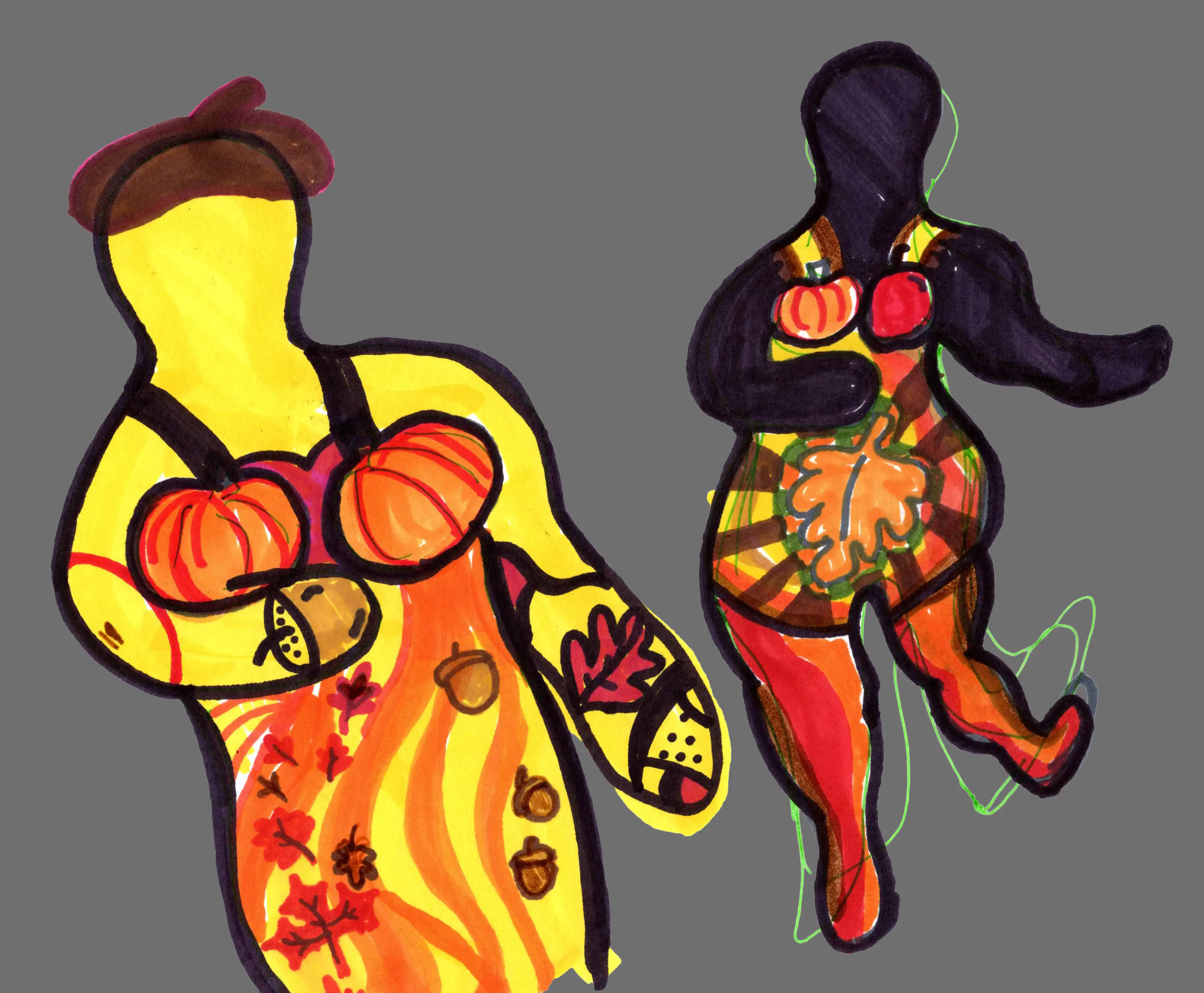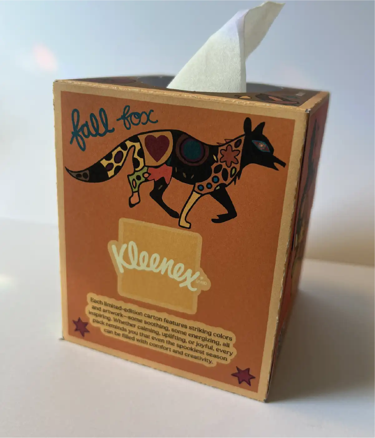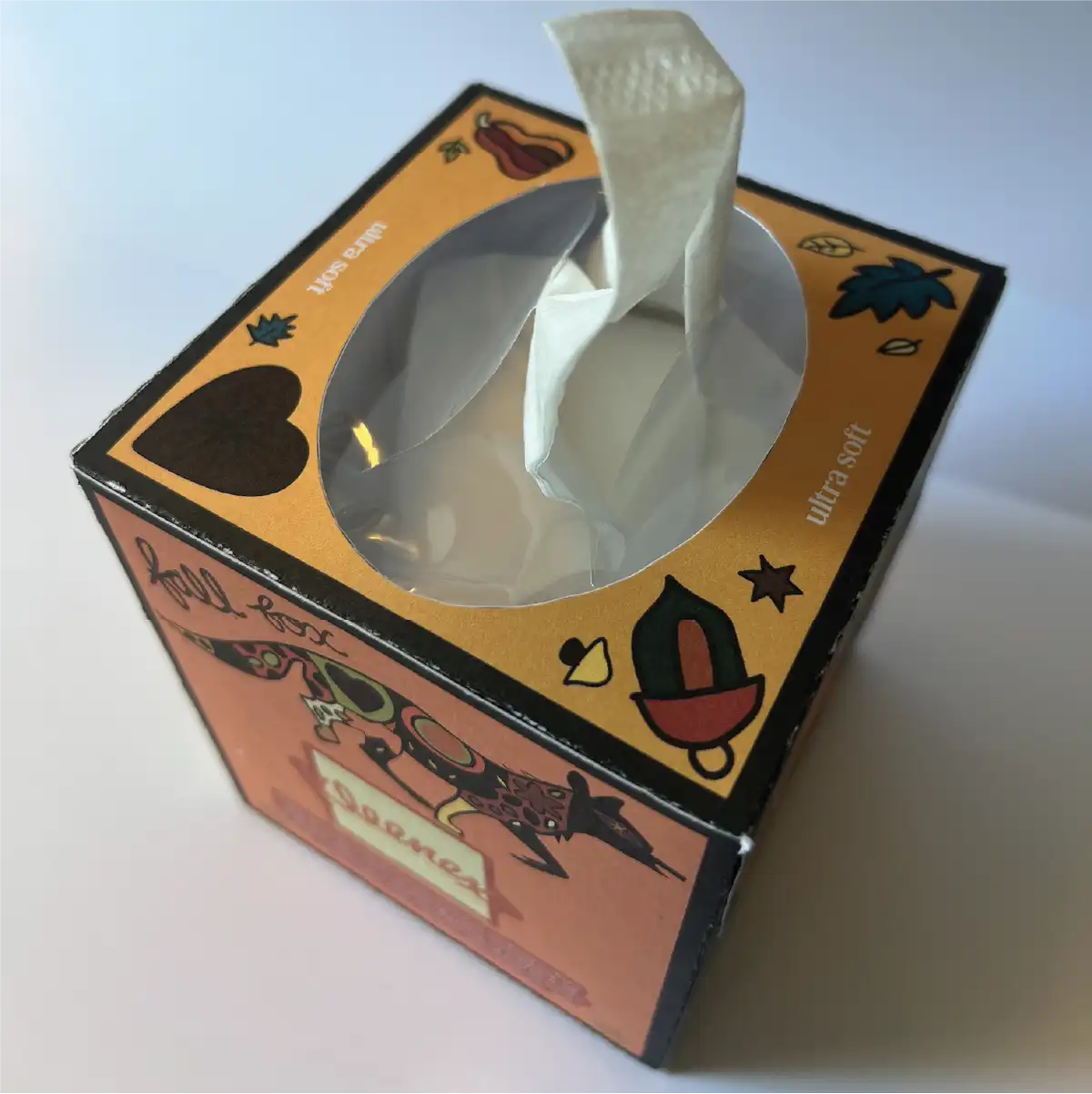 To make the series feel more cohesive, I designed four boxes as a unified set using Nikki de Saint Phalle's pop art as inspiration. Since her physical sculptures—with their multi-medium inlays—could not be translated directly onto a Kleenex box, I created my own vector-based drawings, incorporating an overall fall motif to decorate each side. I used strokes of varying weights to emphasize shifts in color, echoing how her real-life mosaics use different materials to create texture and visual contrast.