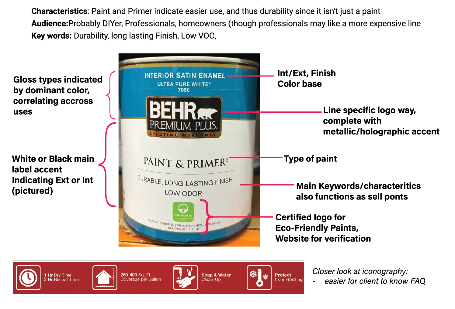 Without a doubt, paint aisles are overhwelming as boring labels loom, it can be hard to make out each brand; drastically reformatted labels depending on quality, shifting logo styles, and information placement. I boiled down the most basic ones, and identified the crucial information to include.