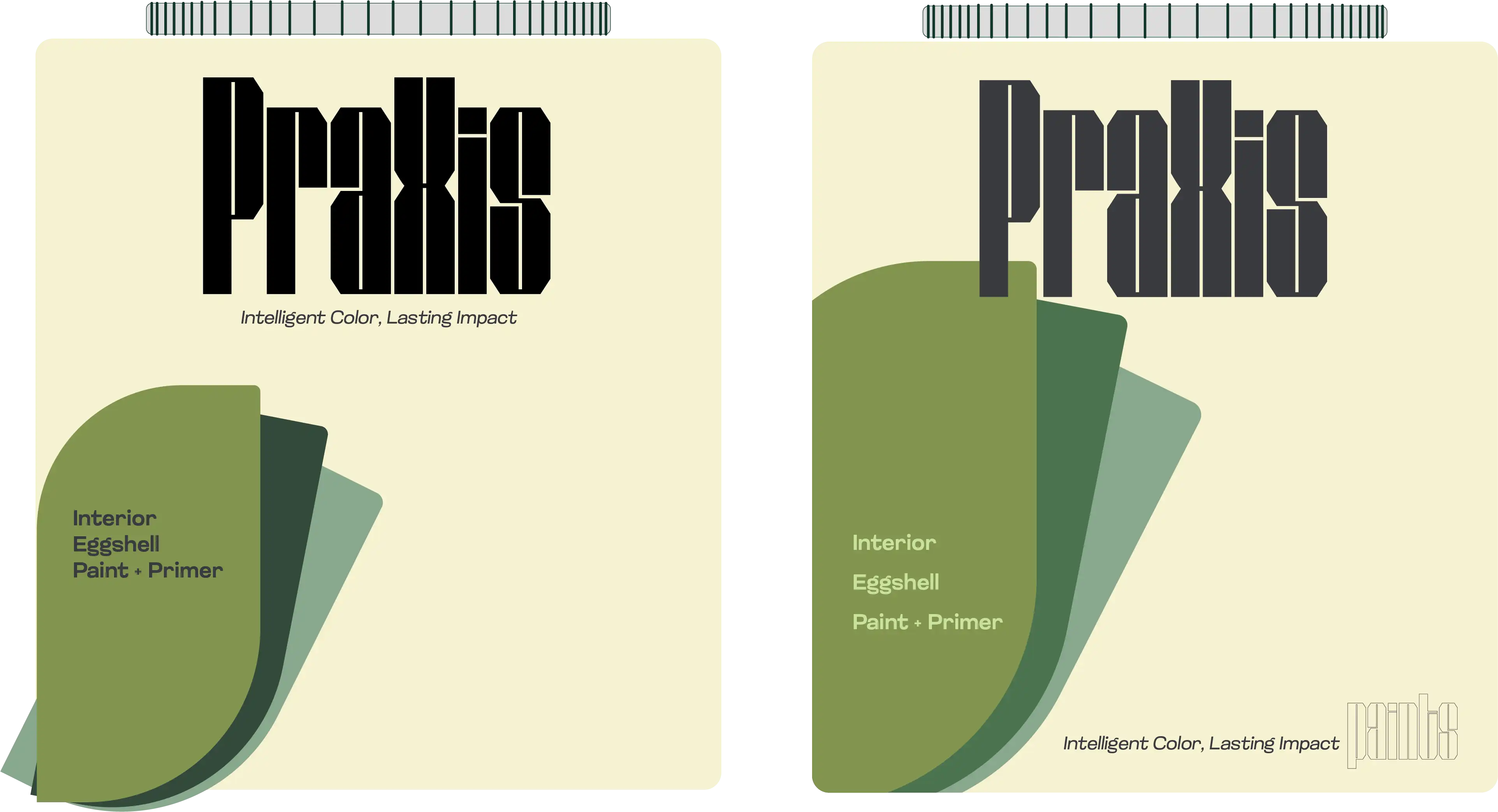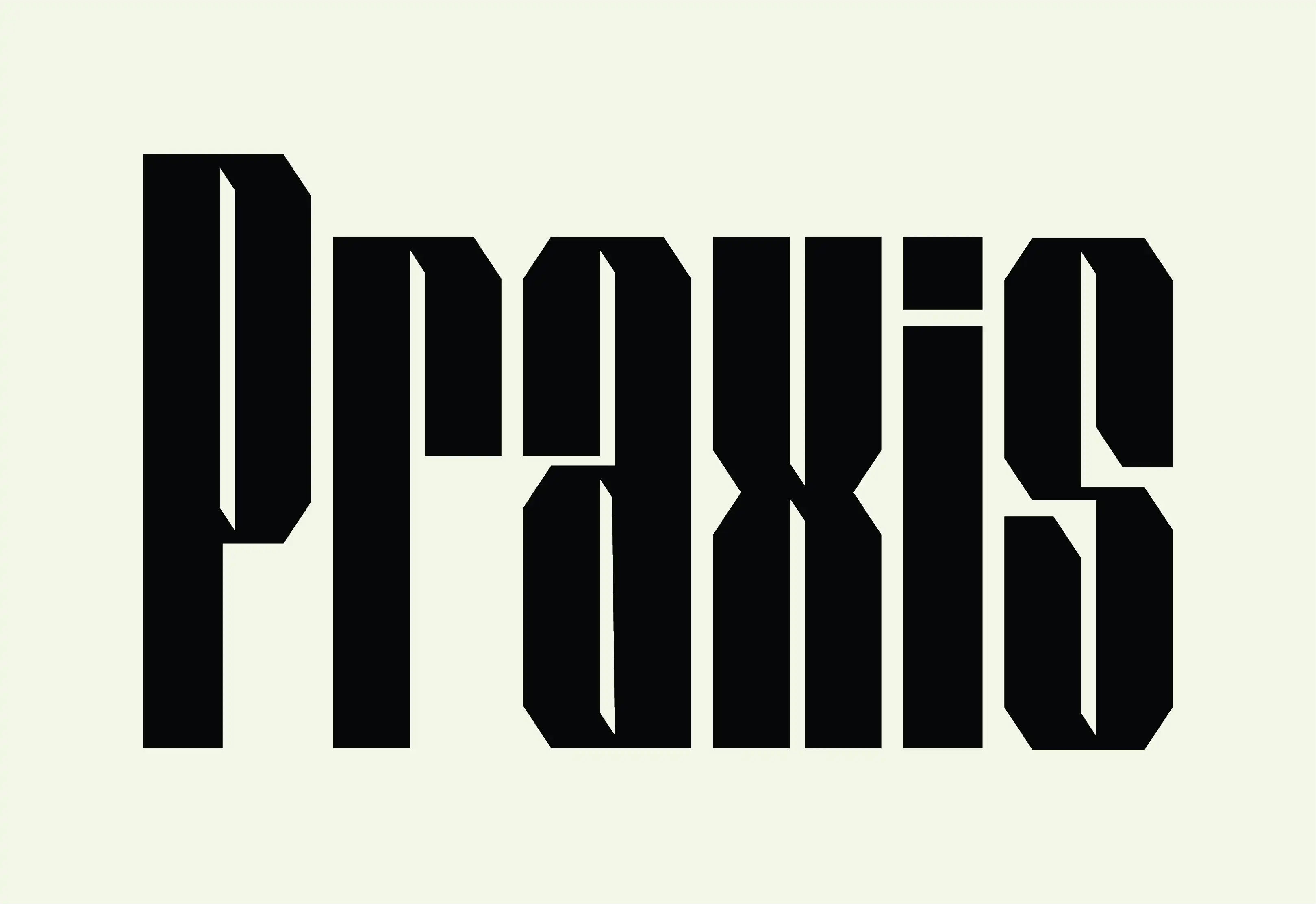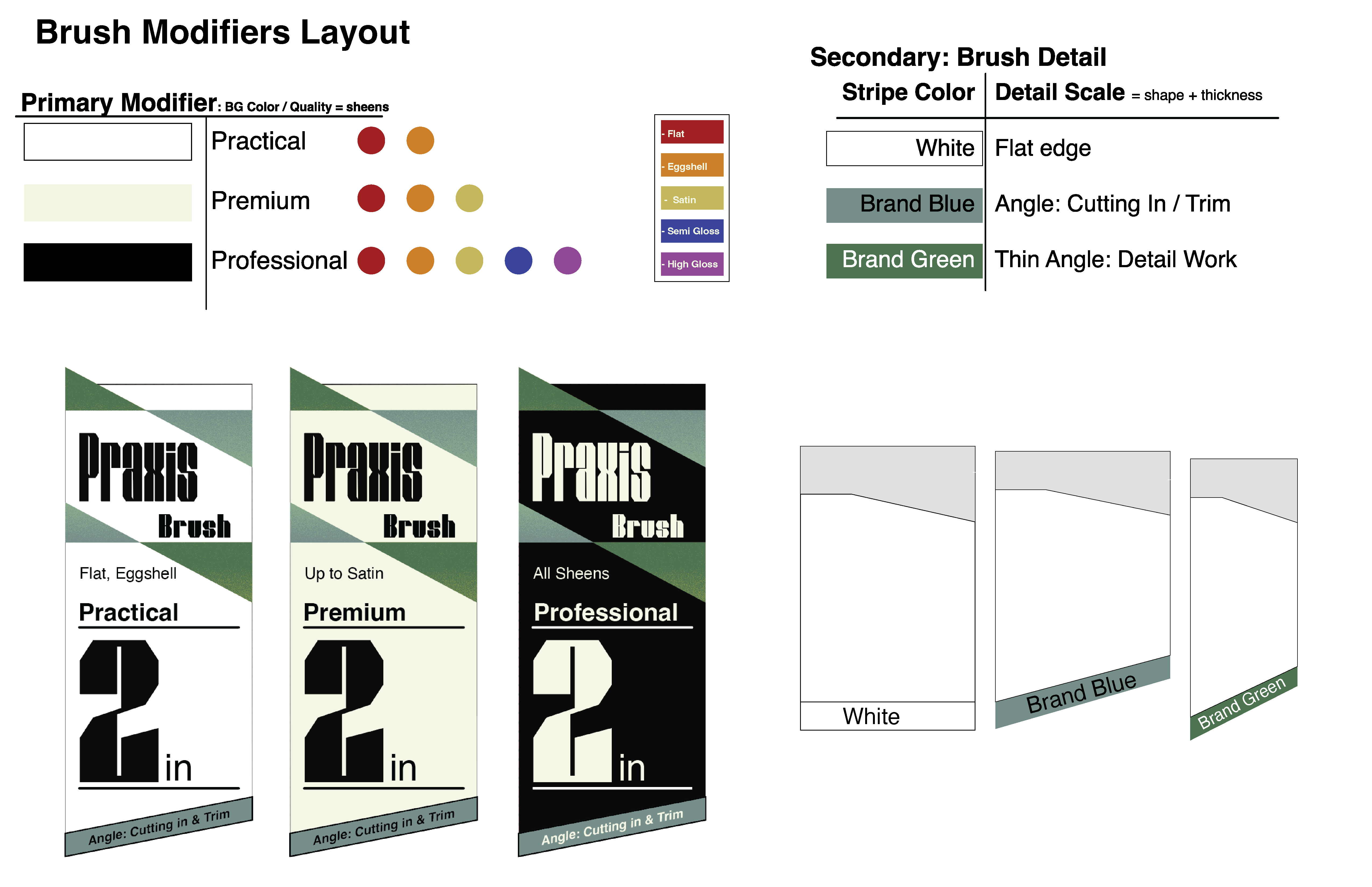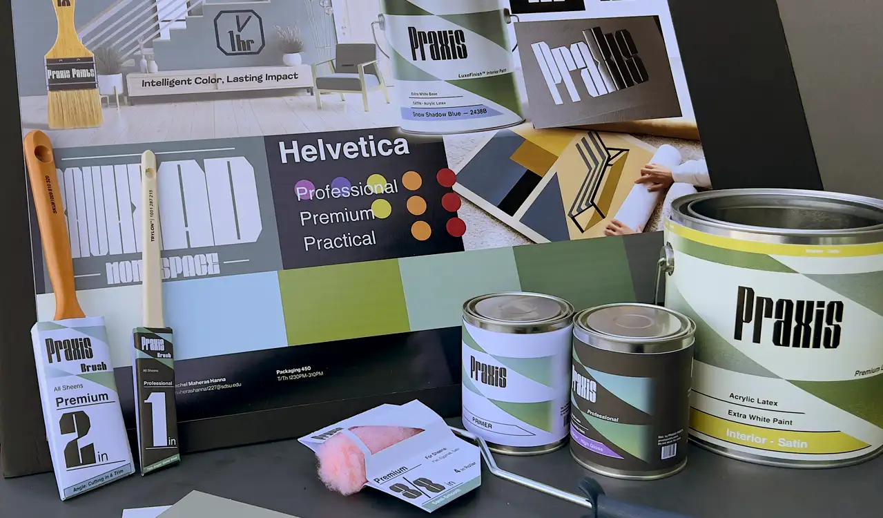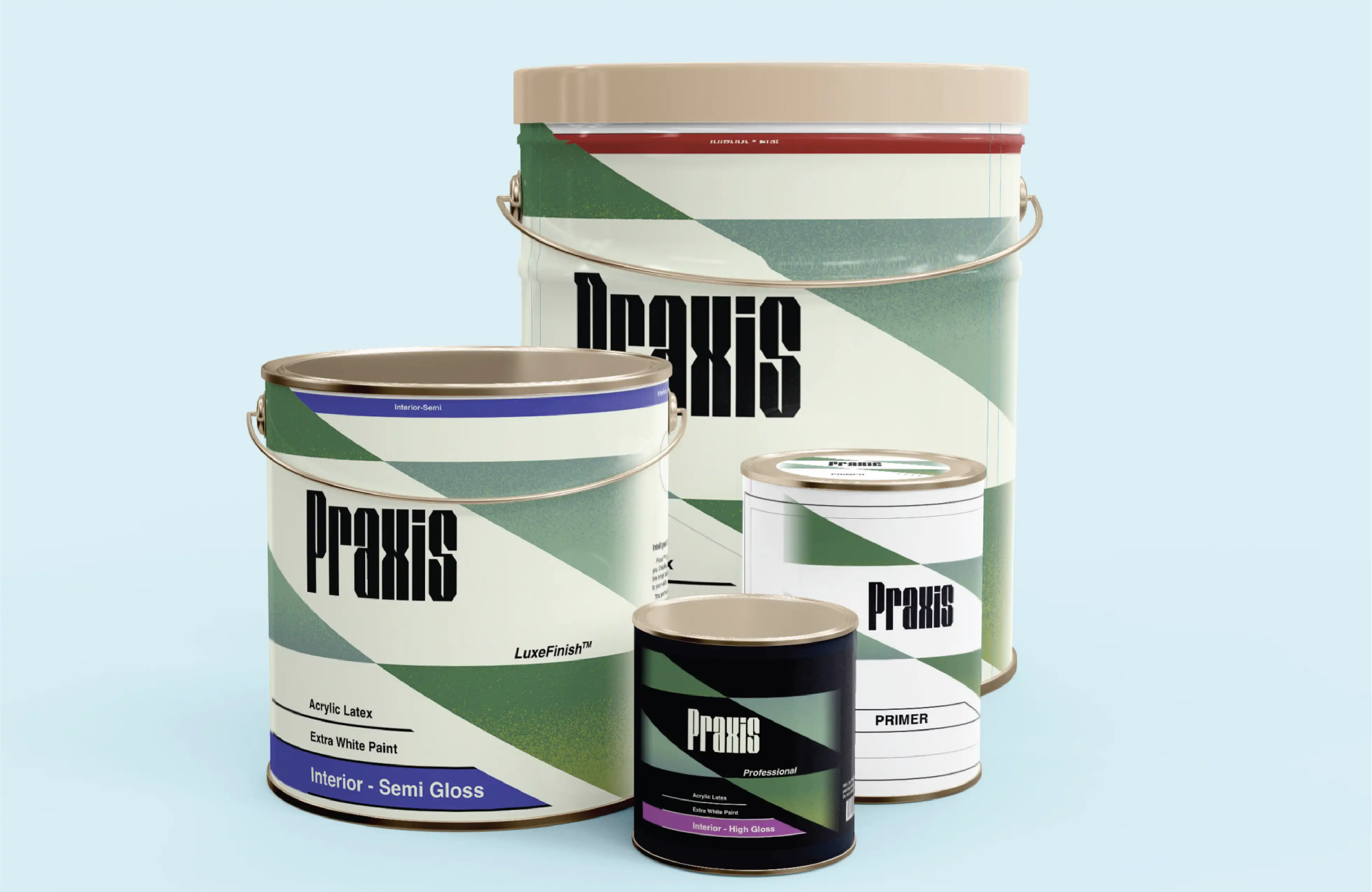 Praxis relies on a heavy geometric typeface with repeating angles found in the letters edges, negtaive space, which mirroed in the angles of the brand's other elements. To stand out on the shelf a color system was developed for the grade or level of the tools and paints used,