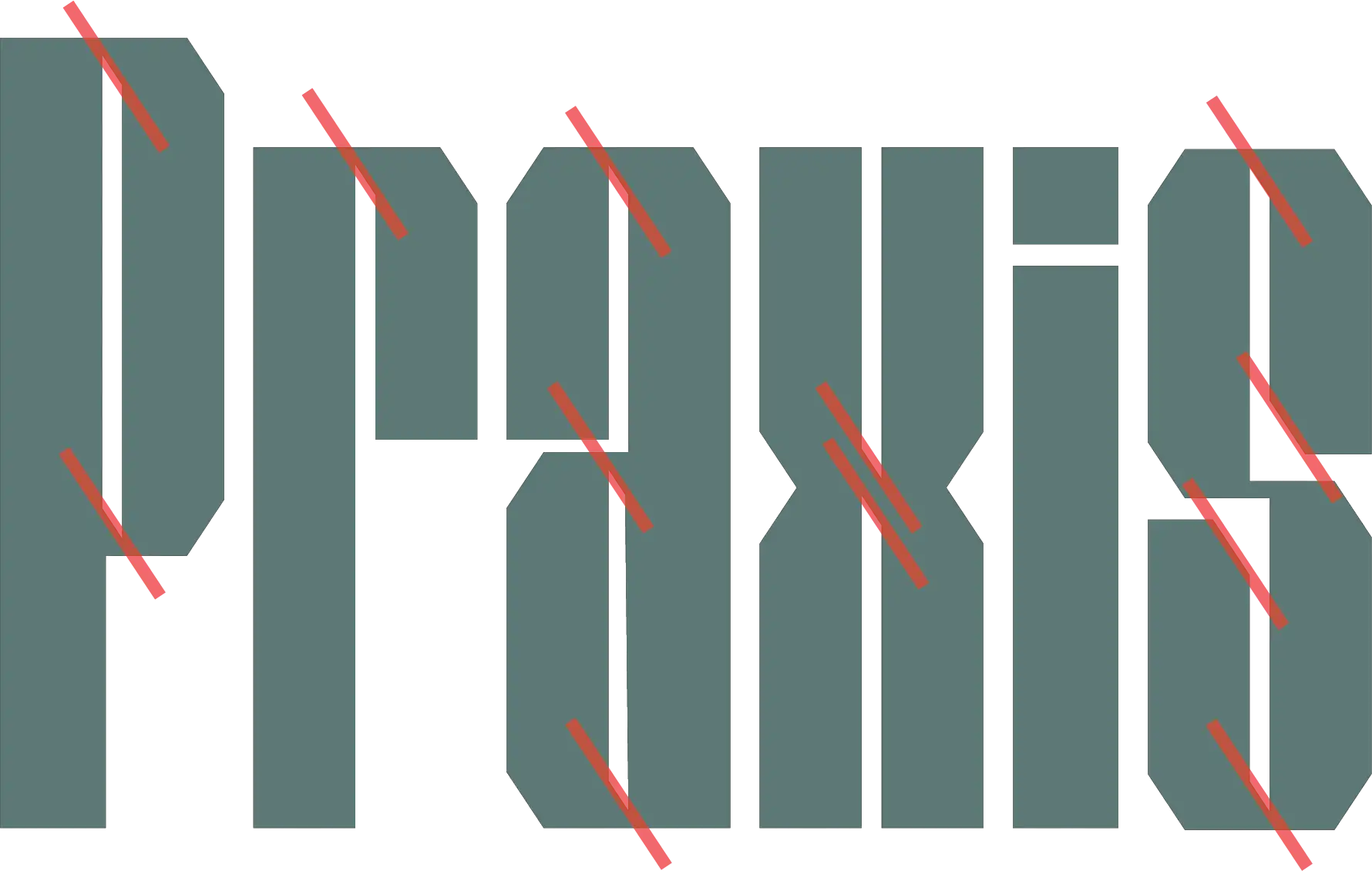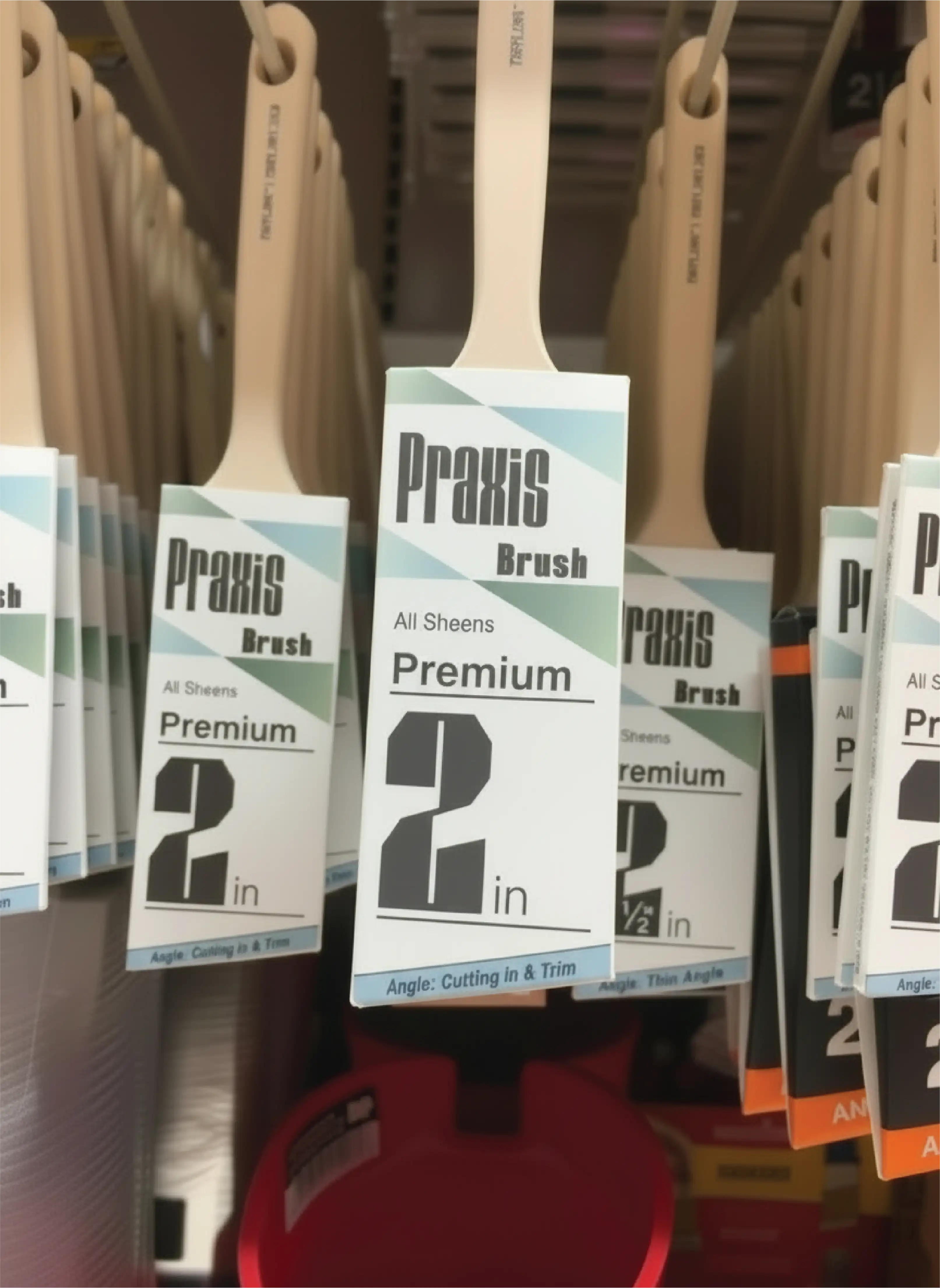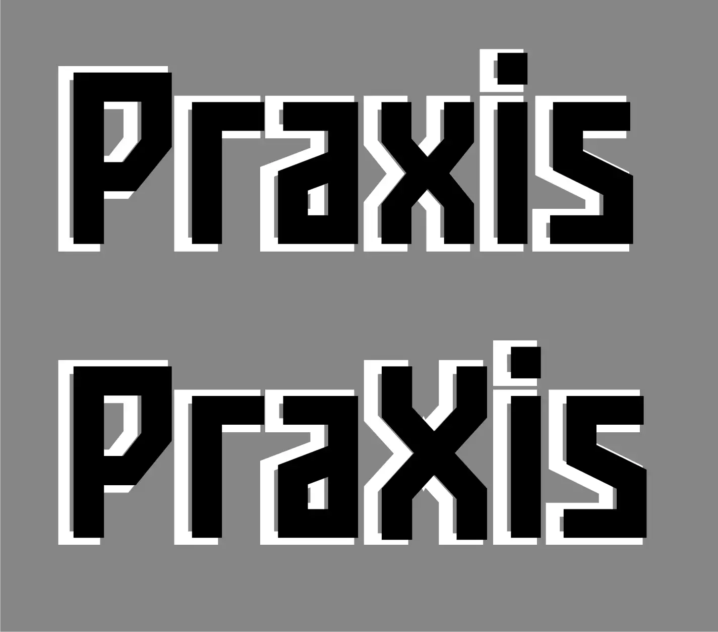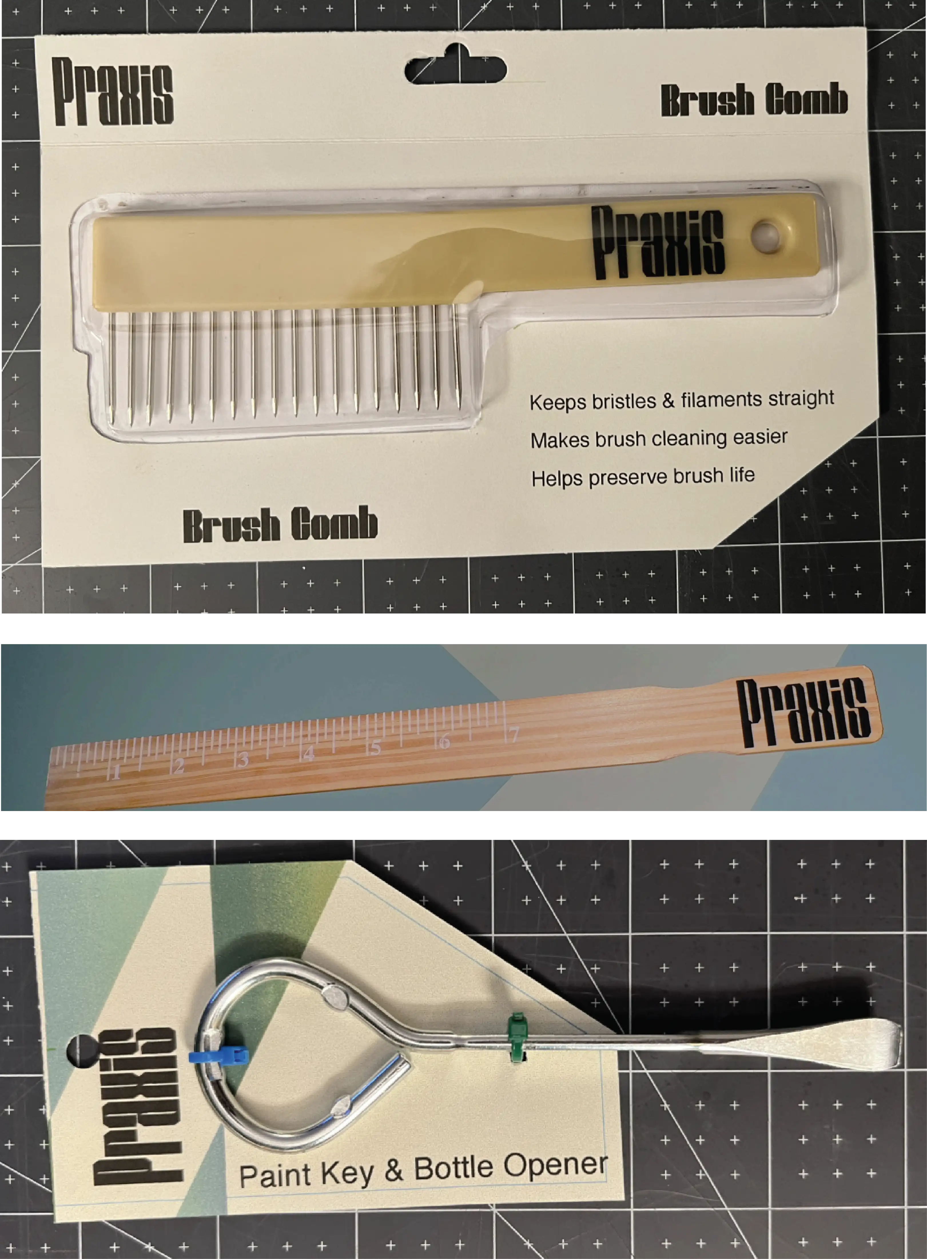 Praxis relies on a heavy geometric typeface with repeating angles found in the letters edges, negtaive space, which mirroed in the angles of the brand's other elements. To stand out on the shelf a color system was developed for the grade or level of the tools and paints used,